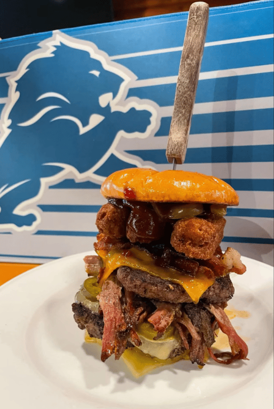 Featuring two half-pound patties stacked high with mozzarella sticks, smoked brisket, and all the fixings, the burger is as bold and unapologetic as the coach it honors. It first made its debut during last season’s playoff run and has now returned just in time for the Lions’ 2025 campaign.